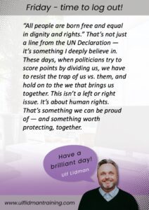 Ulf är en färgstark och fängslande föreläsare som är skicklig på att väcka intresse i sin publik. Ulf har ett bra upplägg och ett genuint engagemang och han berör många viktiga och svåra samtal på ett sätt som ger en stark tro på människor och de möjligheter som finns att utvecklas. När man lyssnar på Ulf känner man igen sig och blir bekräftad men också utmanad både som ledare, kollega och medmänniska.